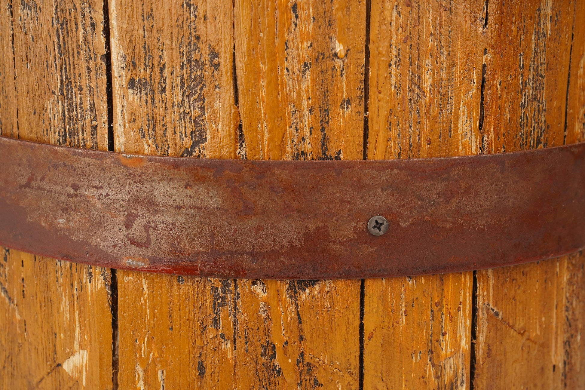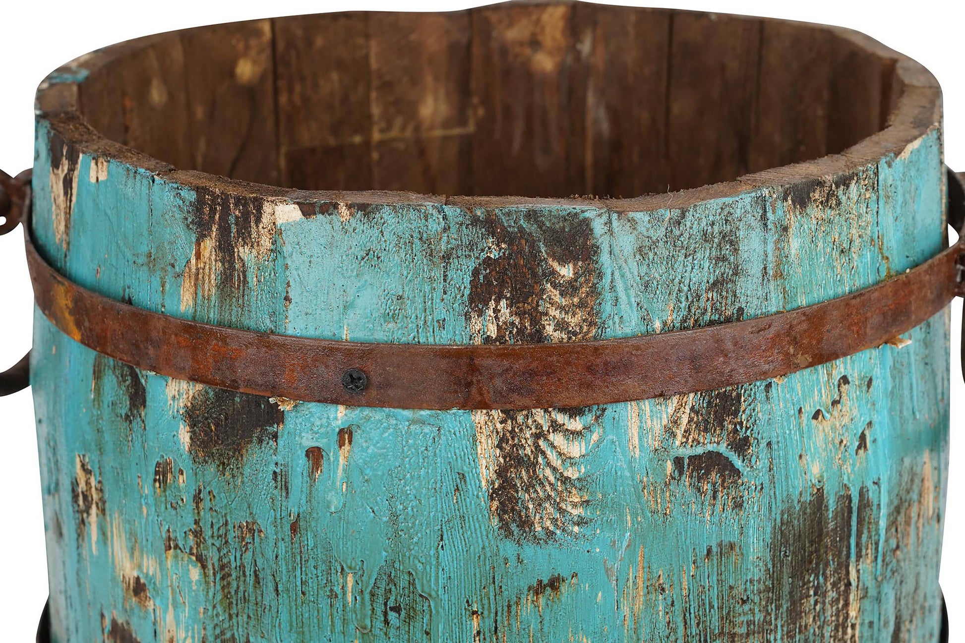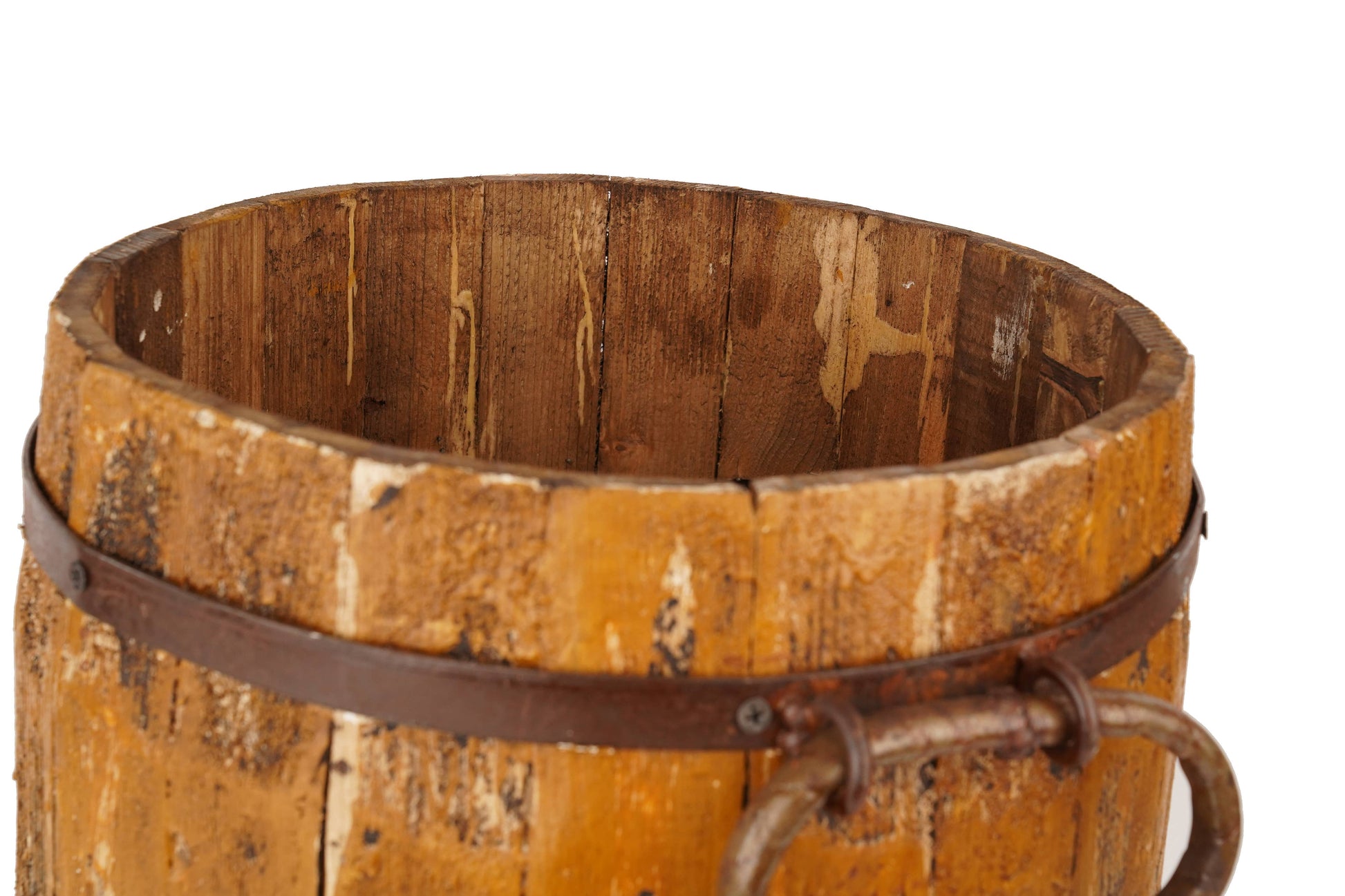 This wooden planter bucket measures about 15W x 18H inches and is completely handmade. The width is 15 inches in total including the handles. The bucket alone, width is about 12 inches. They are made out of wood and hand-painted. Each may vary slightly.