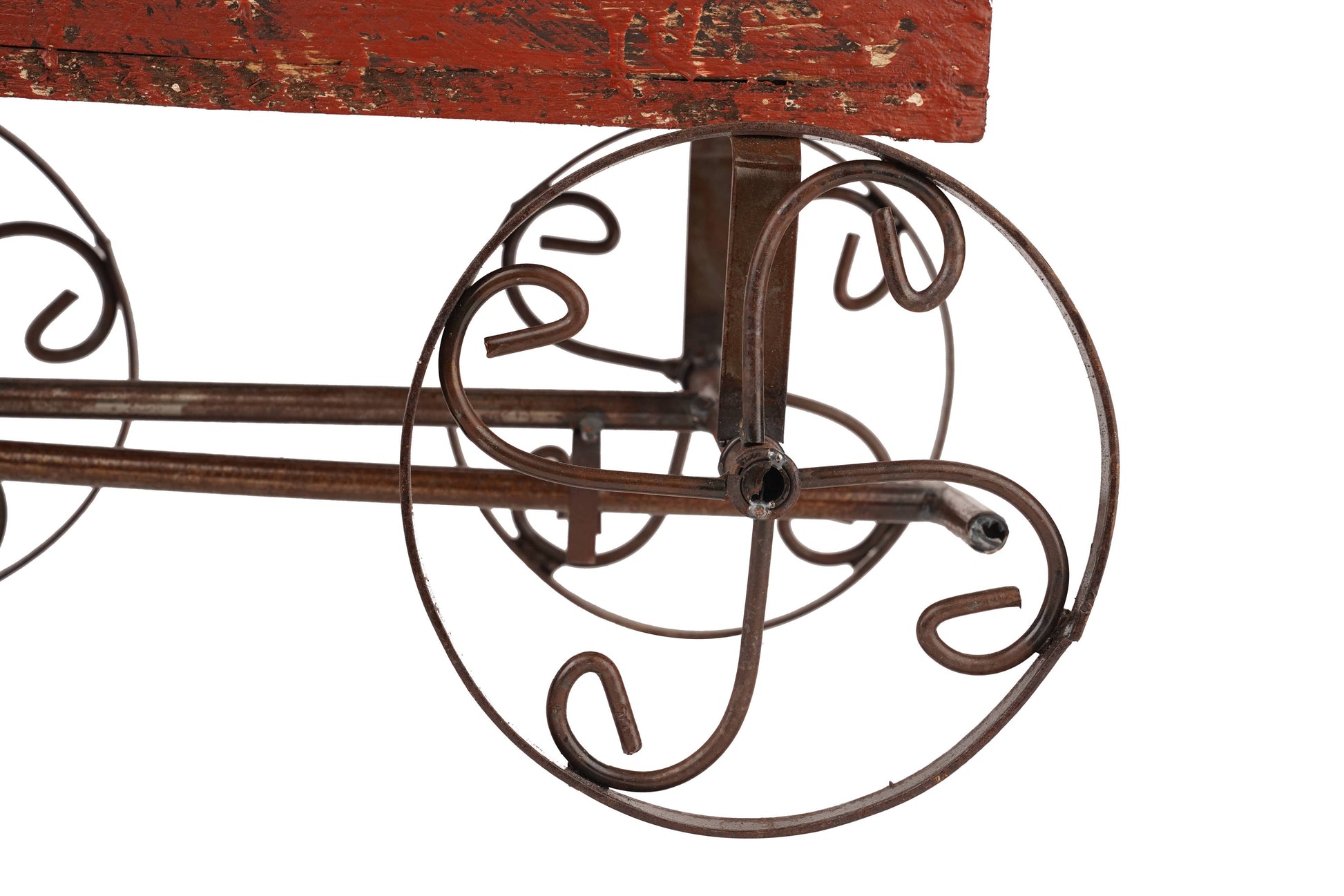 Using reclaimed wood, this wagon measures about 11.5W x 16Lx 13H inches and is completely handmade. The total length, including the extended front handle, measures 35 inches. The metal handle snaps easily under the wagon.