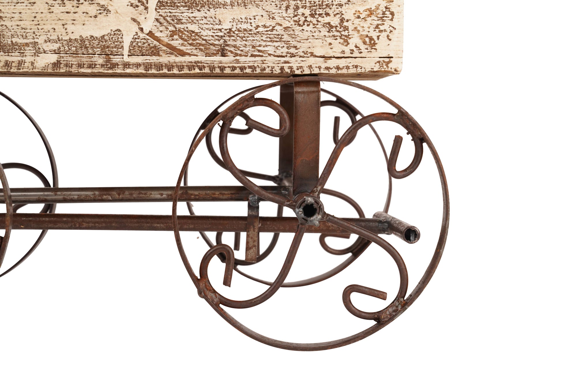 Using reclaimed wood, this wagon measures about 11.5W x 16Lx 13H inches and is completely handmade. The total length, including the extended front handle, measures 35 inches. The metal handle snaps easily under the wagon.