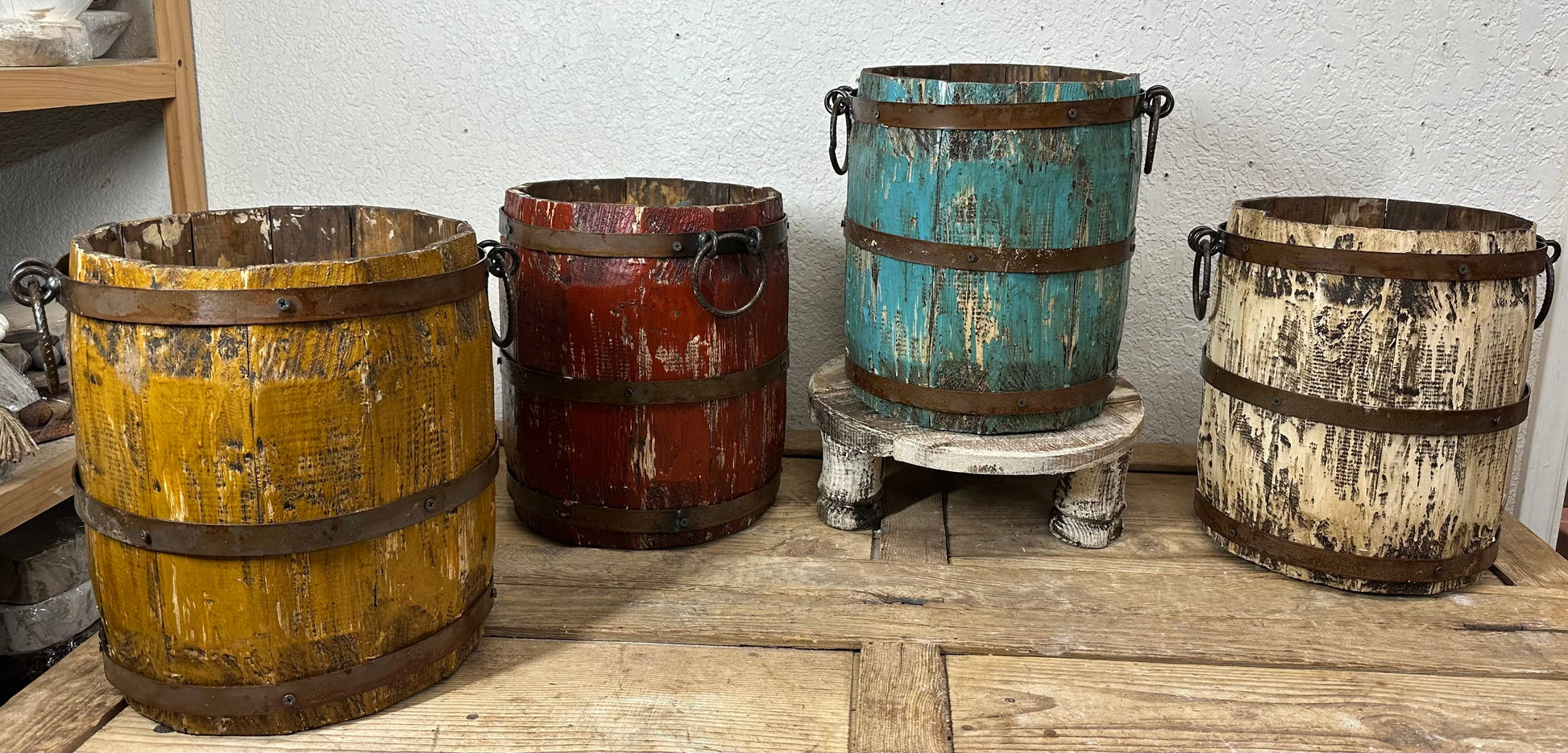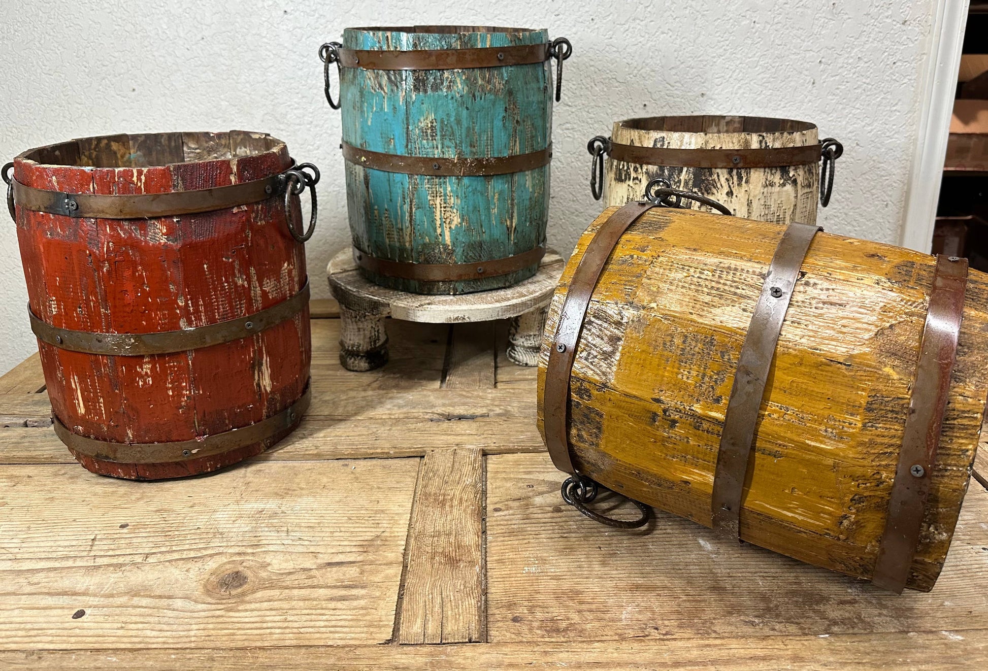This wooden planter bucket measures about 13.5W x 13H inches and is completely handmade. The width is 13.5 inches in total including the handles. The bucket alone, width is about 10.5 inches. They are made out of wood and hand-painted. Each may vary slightly.