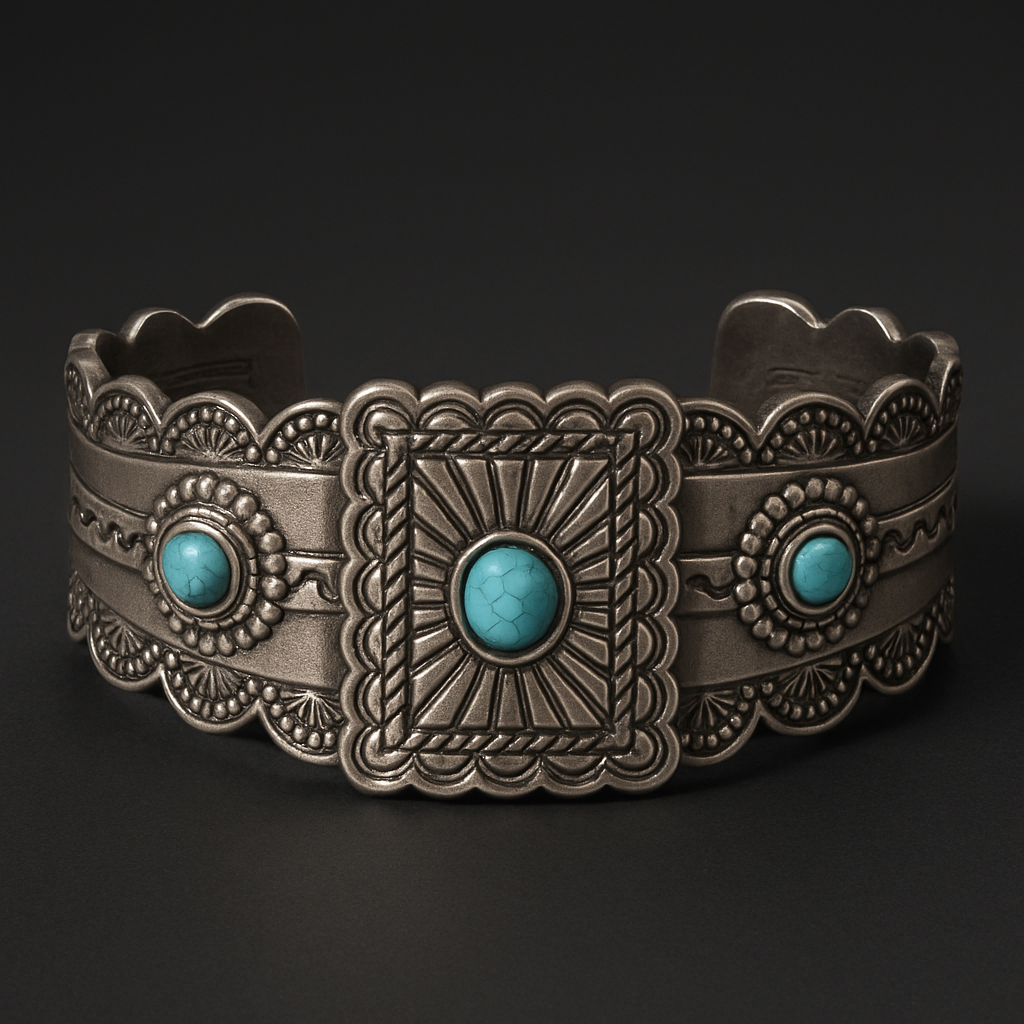 Capture the spirit of the West with this stunning cuff bracelet, designed to bring timeless western charm to your style. Crafted from silver-tone metal, it features intricate tooled detailing reminiscent of traditional western silversmithing. It is adorned with imitation turquoise cabochons, each stone highlighted by scalloped edges and engraved patterns that add depth and character.